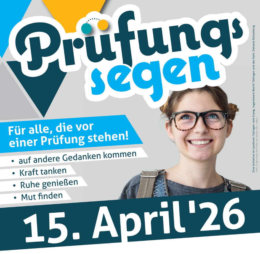Am Mittwoch, den 15. April 2026 findet der ökumenische Prüfungssegen in der evangelischen Martin-Luther-Kirche in Mössingen statt. Zwischen 18 und 20 Uhr sind alle, die vor einer Prüfung stehen ganz herzlich eingeladen, sich eine kurze Auszeit in der Kirche zu nehmen. Es sind dort mehrere Stationen zur Prüfungsvorbereitung aufgebaut. Am Ausgang gibt es noch die Möglichkeit, sich den Segen für die Prüfungen zusprechen zu lassen und ein kleines „Energiebündel“ mitzunehmen. Herzliche Einladung!