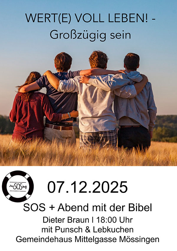 Gemeindehaus Mittelgasse Mössingen Mittelgasse 19, MössingenHallo zusammen, der nächste SOS findet am 07.12.2025 um 18.00 Uhr im Gemeindehaus Mittelgasse in Mössingen statt. Infos folgen. Bist du neugierig geworden? – Wir freuen uns, wenn du vorbeikommst! Bring gern noch jemanden mit! Jede Altersgruppe ist herzlich willkommen! … Weiterlesen